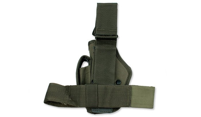 Die Waffe wird durch einen längenverstellbaren Riemen mit doppeltem Klettverschluss gegen Herunterfallen geschützt. Aufgrund seiner Größe, Holster passt die meisten Modelle von Pistolen Firmen wie Glock, Colt, etc.